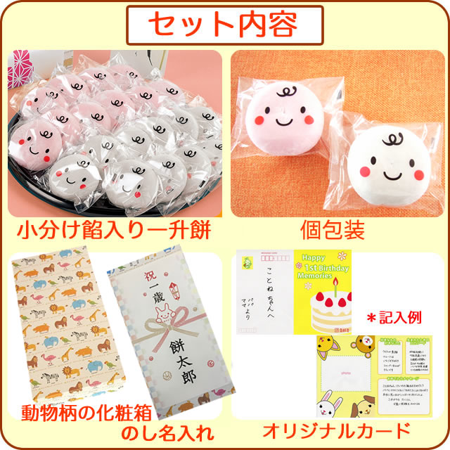 | 商品説明 | 笑顔包装 一升餅セット(紅白あん餅 20個入り) 全国発送いたします。(一部地域を除く) お祝いが終わったらお餅は、親戚やご近所などにおすそ分けして、沢山の幸せが訪れるように、なるべく多くの人達に召しあがっていただきたい。 |